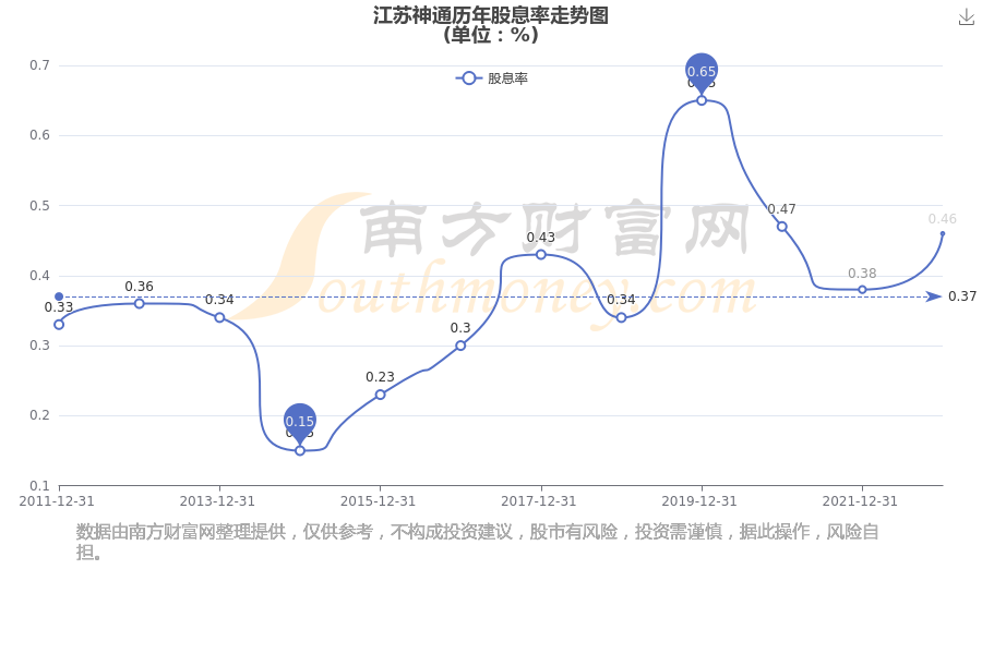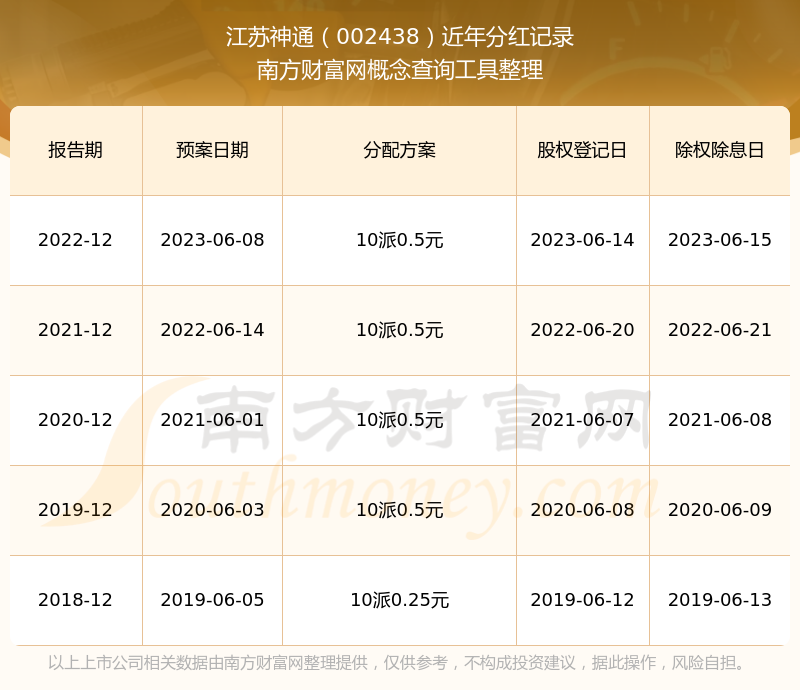 江苏神通最新一次公布的分红方案为10派0.5元。本次权益分派股权登记日为2023年6月14日,除权除息日为2023年6月15日,派息日为2023年6月15日。