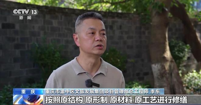 重庆市渝中区文旅发展集团项目管理部总工程师 李东:按照原结构、原形制、原材料、原工艺进行修缮。我们连窗棂木纹都按照1938年的档案进行复原,就是要砖瓦自己“说话”。