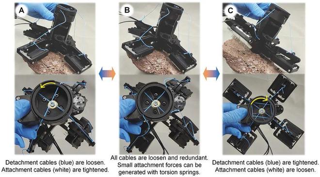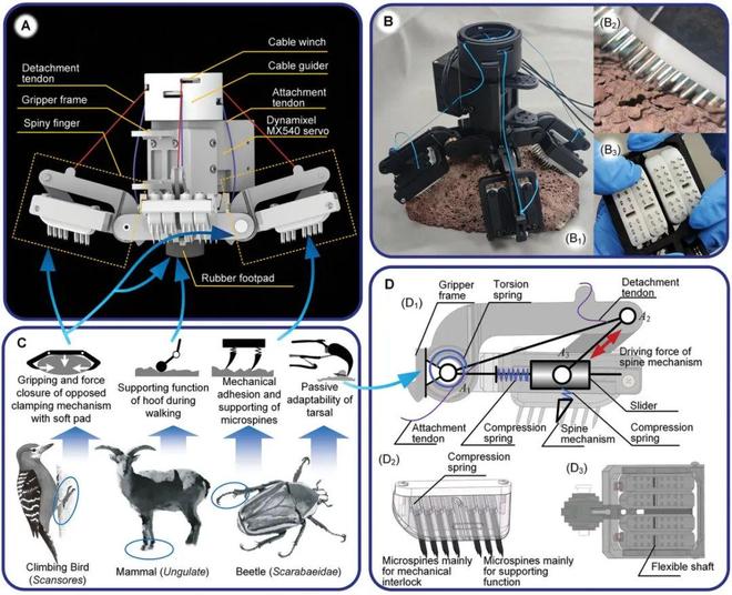 针对当前附着装置对岩石形状适应能力有限、无法同时满足快速行走与攀爬需求等问题,研究团队提出了基于融合仿生的机器人创新设计方法(融合仿生设计,其可理解为对不同生物体的运动机制和形态功能的整合,或融合不同生物学原理应用于工程设计,以实现更佳的功能和性能),并借鉴甲虫跗节链、攀禽爪手、哺乳动物蹄部的形态-结构,设计了具有附着-支撑功能的半被动、自适应的爪刺式攀岩爪手(A semi-passively actuated, structure-adaptive, and spiny gripper,简称SPASAS gripper)。