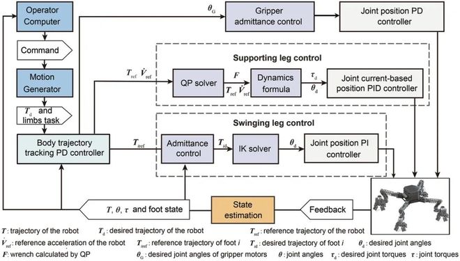 通过采用如图6所示的分层级和分布式的控制策略,研究团队将攀岩机器人的复杂控制系统拆解为多模块和子问题并逐一将其解决,其中主要包括机身轨迹追踪控制、爪手导纳控制、摆动腿基于逆运动学的控制、支撑腿基于附着力优化的平衡控制、底层关节基于电流的PID控制和状态估计等子模块,从而减小机器人的内力,避免单一附着装置承受过大载荷导致的失效。根据附着装置系统的刚度特性,对其在非抓持和抓持状态进行变刚度控制,并结合摆动腿的导纳控制实现对高低起伏地形的自适应盲走步态,研究团队降低了建模的复杂度和计算成本。