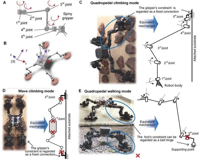 基于附着装置的多模态属性,研究团队利用对仿爬行动物四足构型的演变和基于旋量理论的运动学分析,设计了可实现自由攀爬和多运动模态的攀岩机器人机构构型,其具备类四肢动物攀爬、波动攀爬和类四足动物行走三种运动模态(如图5所示),可针对不同地形与倾角切换模态,提高了机器人的地形适应能力和运动效率,解决了此类机器人沉重复杂、不兼具稳定攀附和快速行进能力的问题。