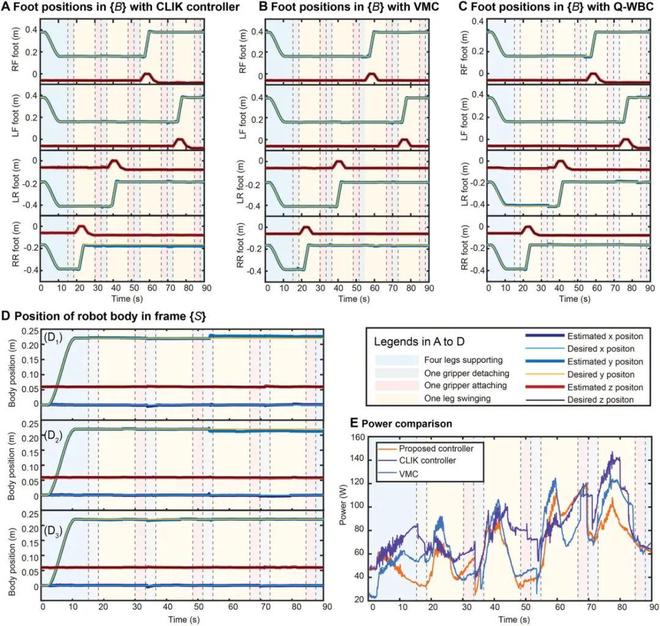 研究团队提出的基于攀爬机器人动力学模型的Q-WBC控制方法,可优化爪手间的附着力分配,提高了机器人对外部环境的柔顺性和适应性,减少了攀爬机器人的内力扰动,还可避免应力集中到某一爪手导致的附着失败,提高了机器人攀爬步态的成功率。此外,与仅使用闭环运动学控制、虚拟模型控制控制算法相比,该方法还减少了机器人在攀爬过程中的总能耗和关节的峰值功率。