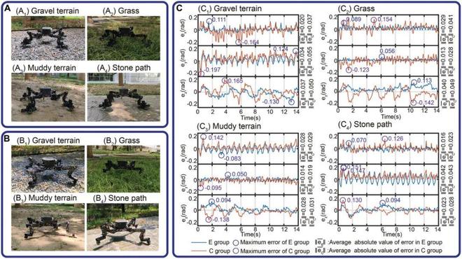 研究团队在重力下对MARCBot进行了平地快速移动和攀岩测试,其可完成在多种复杂环境的对角小跑,速度达214 mm/s,是同类攀爬机器人中唯一具备此功能的样机。图8展示了机器人采用SPASAS gripper作为足端(图8A)与普通球状足(图8B)作为足端的行走对照实验,结果表明SPASAS gripper显著减小了机器人在草地、沙地、碎石等地形上的机身姿态误差和摆动幅度,提高了机器人在附着地形行走的稳定性。