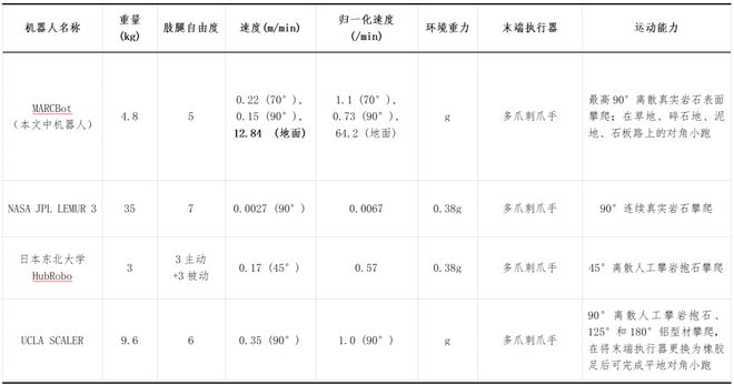 表1为MARCBot与其他攀岩机器人的对比,MARCBot具有更好的地形适应能力,其无需更换末端执行器即可在各种复杂地形中移动,在攀爬重力和速度方面也展现出先进水平,表明该研究成果在机器人的野外作业以及星球探测领域具有广阔应用前景。