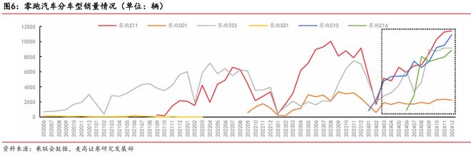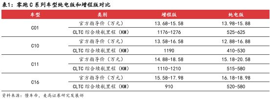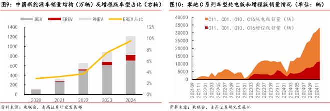 随着市场上越来越多的增程版 车型上市,增程版本车型的销量也在快速增长。2024年增程车型销量达到116万辆,同比增长 75%,在新能源车中的占比也提升至了9.55%。我们认为增程作为没有里程焦虑的技术路线,仍 会有很长时间的过渡期和较大的市场空间。零跑的C系列增程版车型也给公司贡献了较大的销 量:2024年合计销量超过7.4万辆,占全部C系列销量超过33%。因此,我们认为零跑的增程战 略收获了显著的成效,为公司做出了可观的销量贡献。