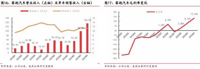 受益于汽车销量的持续走高,公司经营业绩稳步提升。2024 年,零跑实现营收 321.6 亿元,同比增长 92%,展现出强劲的市场竞争力。在毛利率方面,零跑实现了从亏损到盈利的关键转变:2023 年第三季度,单季度毛利率首次转正,达到 1.2%;2024 年全年毛利率进一步提升至 8.4%,其中第四季度毛利率更是攀升至 13.3%,创下历史新高。