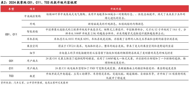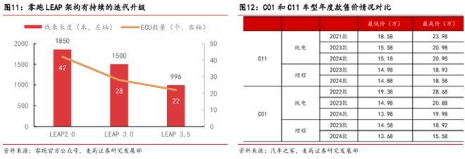 以 C01 和 C11 为例,2023 款和 2024 款车型上市时起售价均有所下降,有力支撑了销量的稳定。同时,零跑在改款升级过程中,十分注重倾听消费者反馈,针对用户关心的领域和普遍存在的痛点进行改进,如在 2024 款 C01 后排天幕玻璃增加织物遮挡以提升防晒效果,在 C11 底盘加装 FSD 可变阻尼减震器来提高驾乘舒适度等,充分展现了公司强大的产品打造能力。