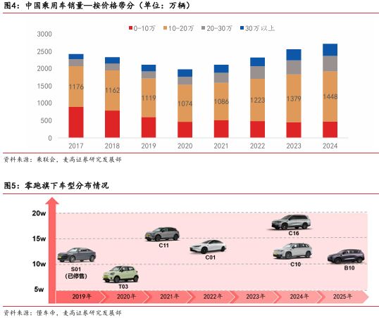 在产品战略布局上,零跑汽车精准锚定 10 - 20 万这一主流乘用车市场。这一价格区间不仅契合中国中产家庭及普通家庭的购车预算,也能充分满足日常通勤与短途出行的配置需求,是整个汽车市场中最具活力与竞争力的细分领域,年销量稳定在 1000 万辆以上且呈逐年递增趋势。零跑汽车通过不断完善 C 系列、B 系列等车型矩阵,除 T03 外,主销配置均集中于该价格带,从而有效覆盖了广泛的主流汽车消费群体,为市场开拓奠定了坚实基础。