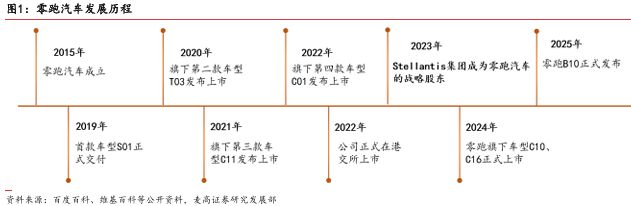 1.1 零跑聚焦在10-20万主流市场,坚持全域自研路线年,一步一脚印稳步前行发展。2015年12月,大华股份与控股股东傅利 泉、董事朱江明等创立了浙江零跑科技有限公司。2017年3月零跑汽车品牌正式发布、2019年 1 月零跑旗下首款车型S01正式上市。随后零跑汽车又陆续推出T03、C11、C01、C10、C16、B10 等多款车型,产品矩阵愈发完善。2022年9月29日,零跑汽车在港交所主板正式挂牌上市。