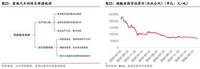 自 2022 年 9 月起,零跑汽车启动全员降本战略,成立跨部门降本委员会,定期研讨降本方案,在生产技术与供应链管理两端同步发力。与此同时,锂电池成本的持续下降也为零跑降本增效提供了有利外部环境。以 6 个月为周期,截至 2024 年 3 月,零跑在三个周期内累计实现降本 16%、16%、10%,18 个月累计降本超 40%,生产端成本得到大幅优化。