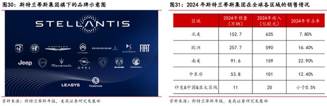 斯特兰蒂斯集团由菲亚特克莱斯勒汽车与标致雪铁龙集团合并而成,作为全球销量第四的跨国车企,业务覆盖 130 多个国家,旗下品牌矩阵涵盖豪华、主流等多细分市场。在区域市场表现中,欧洲与南美是其核心优势市场,2024 年市占率分别达 16.4% 和 22.9%;北美与中东非市场亦有稳定布局,而亚太地区(尤其是中国、印度)则是其战略补强方向。