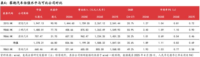 国内部分:我们选取同样在港股上市的造车新势力公司理想、小鹏以及蔚来作为零跑汽车的可比公司。对应2025年营业收入的一致预期,可比公司的PS均值为1.11x,而零跑的PS仅为1.03x, 仍有提升空间。在剔除掉海外车型销量的收入贡献后,我们预计2025年零跑国内销量贡献的营收约为550亿元,参考1.11x的PS水平,对应市值为608.6亿人民币。