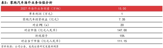 我们认为零跑的海外业务具备独特的竞争优势,有望迅速的兑现落地并具备较高的成长性,因此应该给予零跑汽车的海外业务独立的估值。我们认为到2027年零跑汽车的海外本土化率将达到较高的水平,海外销量将达到15万辆,单车盈利有望达到1万元人民币。保守估计 下给予20x PE的估值水平,对应2027年市值为147亿元人民币。采用15%的折现因子,折算到 当下时点,对应的市值为111.15亿元人民币。