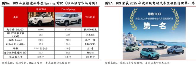 产品力与储备优势奠定市场根基:2024 年,零跑 T03、C10 已登陆西班牙、法国等欧洲市场,展现出强劲竞争力。以西班牙市场为例,T03 较竞品 Spring 在价格、续航、配置上全面占优,且契合欧洲城市道路使用场景,荣获 2025 年欧洲纯电动汽车里程性价比冠军。此外,零跑规划的 3 款 B 系列全球车型将陆续投放欧洲,进一步丰富海外产品矩阵,强化市场渗透力。
