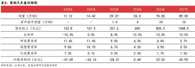 随着多款新车型的陆续上市及渠道数量的增长,我们预测零跑的车型销量将会持续增长。2025 2027 年销量分别为55、70、89万辆,其中海外销量分别为5、10、15万辆。 随着车型销量的提升,我们预计零跑2025-2027年的营业收入将分别达到605、805、1068亿元; 且随着规模优势的进一步凸显和销售结构的持续优化,我们预计 2025-2027 年零跑汽车的毛利 率分别为12.5%、13%、13.5%。 我们预计零跑汽车的研发、销售及行政费用率也将会呈现逐步下行的趋势,推动公司2025-2027 年归母净利润分别实现0.69、22.52、43.92亿元。