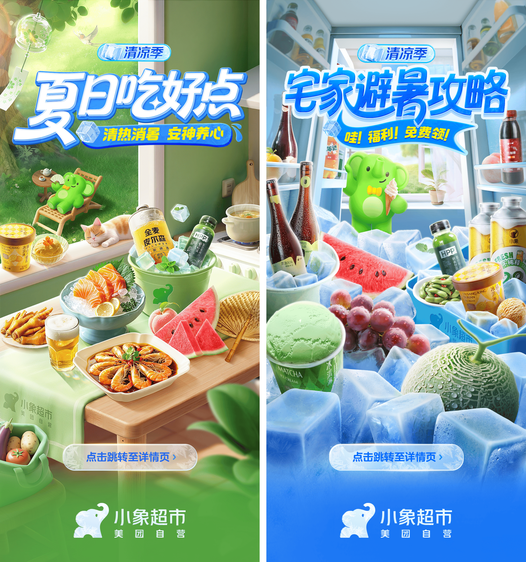 全速围绕“氛围层”、“商品层”与“品牌层”三大维度进行视觉融合,为小象超市“清凉季”主题系列活动中的两档活动提供了主视觉设计。通过锚定冰块等夏日元素,结合冰啤、生鲜等高频品类,在“打造沉浸式清凉感,安抚用户夏日燥热情绪”的同时,刺激消费者购物动机,并深化用户品牌心智。