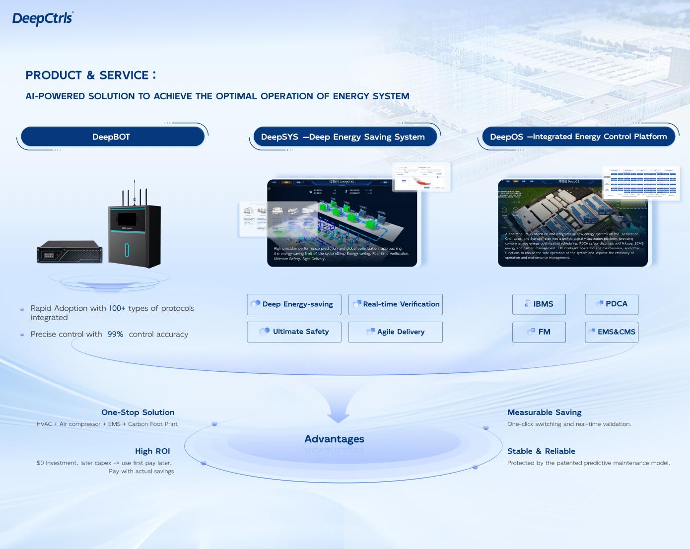DeepSYS——新一代基于“PhyAI”的深度节能系统:深度智控基于“PhyAI”的高精度建模与寻优技术,针对空调、空压等机电能源系统,建立设备层级高精度性能仿真模型(模型预测误差RRMSE3%),在保障终端需求条件下,在系统层级实时遍历计算数十万种设备运行工况组合,寻优“系统总能耗最低时对应的最优运行工况”,实现系统层级的全局主动优化与闭环控制。