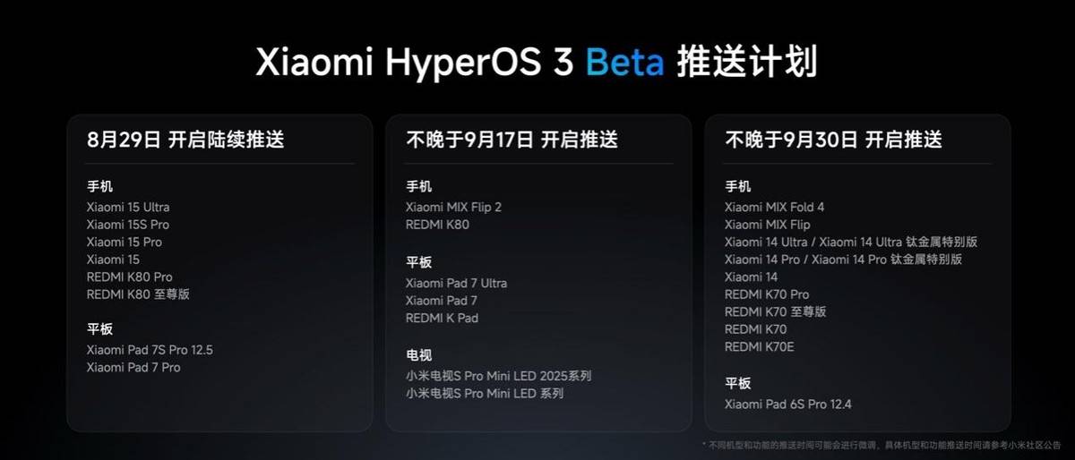 2025年8月28日,小米于北京召开主题为「事事顺心」的小米澎湃OS 3发布会,正式发布小米澎湃OS 3。它以真实用户需求为指引方向,以技术和深入思考提供更优的实现方案,追求用户感官上的「体感顺畅」,为用户带来更加顺眼、顺手、顺心的系统体验。小米澎湃OS 3将于2025年8月29日为首批Beta机型开启陆续推送,覆盖Xiaomi 15系列、Xiaomi Pad 7S Pro 12.5、Xiaomi Pad 7 Pro、REDMI K80 Pro、REDMI K80 至尊版,并将陆续为更多机型开启推送。