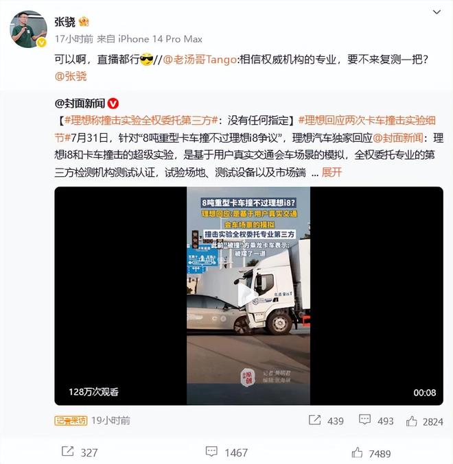 理想汽车的回应也很硬气,首先表示测试是基于真实交通场景的模拟,全权委托第三方检测机构完成,测试车辆、场地、设备等均由检测机构提供,理想方无指定。