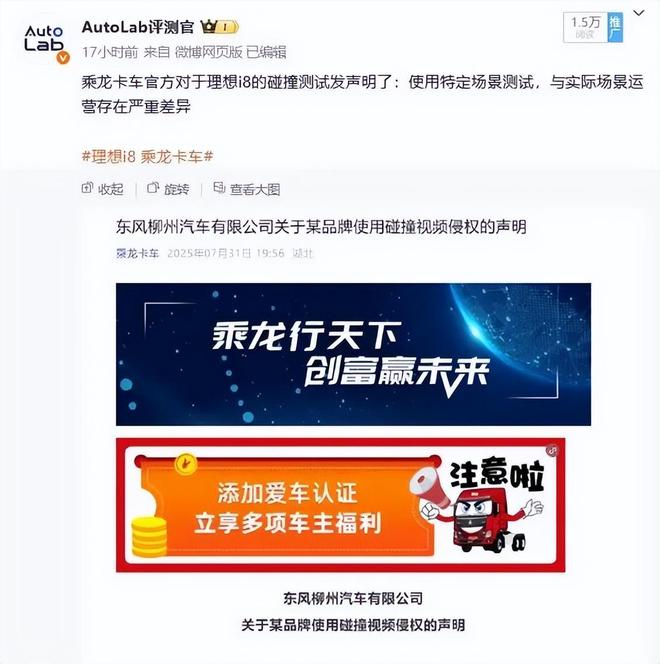 乘龙卡车在舆论发酵后迅速指责该测试构成严重侵权、误导公众,质疑视频真实性,称理想使用特定场景测试,与实际场景运营存在严重差异
